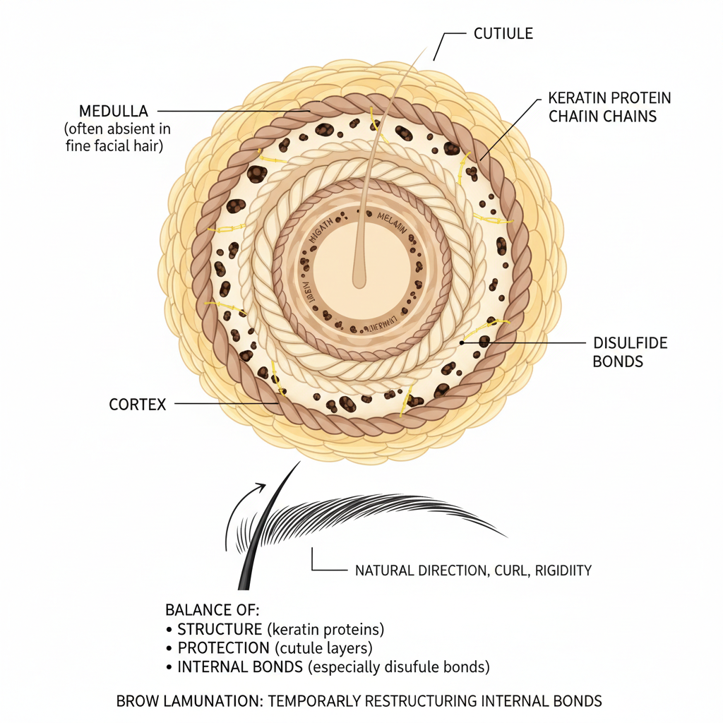 Brow lamination doesn’t work on the surface — it works by temporarily restructuring these internal bonds, allowing the artist to redirect the hair before stabilising it again.